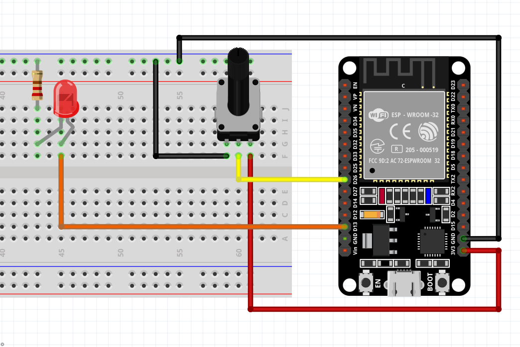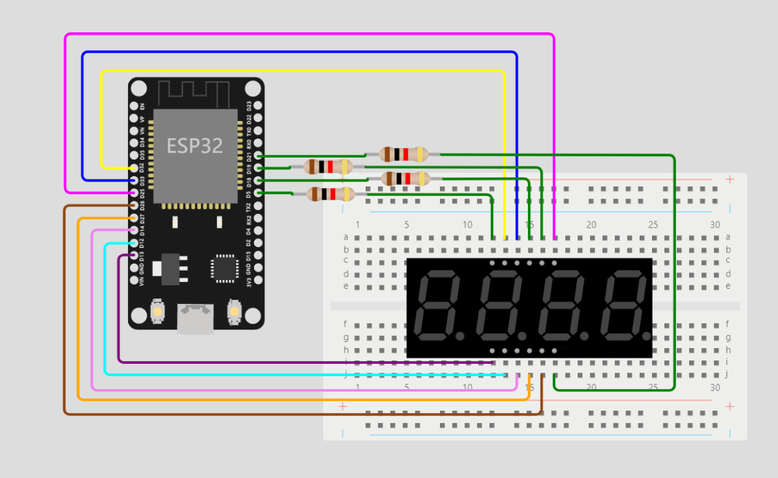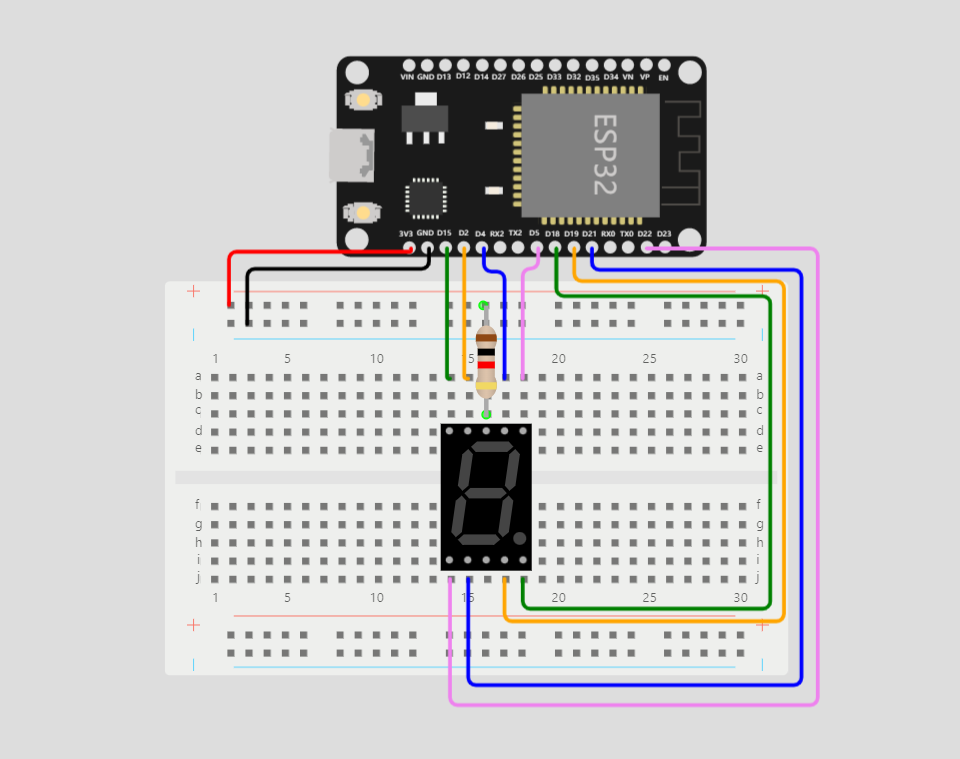 2.用 ESP32 单片机给面包板通电(3.3V 引脚),公共端通过一个限流电阻接电源, 用跳线连通电源和数码管的 LED 引脚,如果亮了说明是共阳型数码管;反之,说明是共阳型数码管。