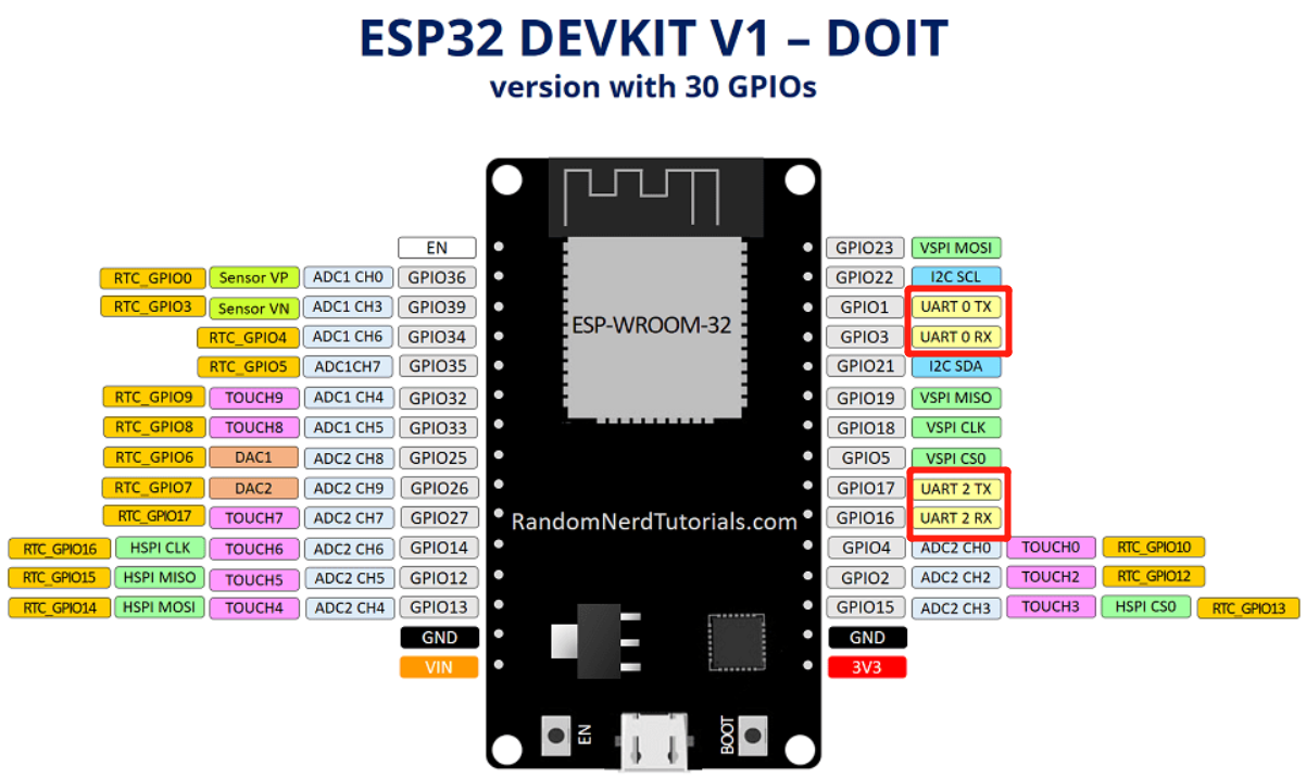 ESP32 有三个硬件 UART:UART0、UART1 和 UART2。它们每个都分配有默认的 GPIO,如下表:
