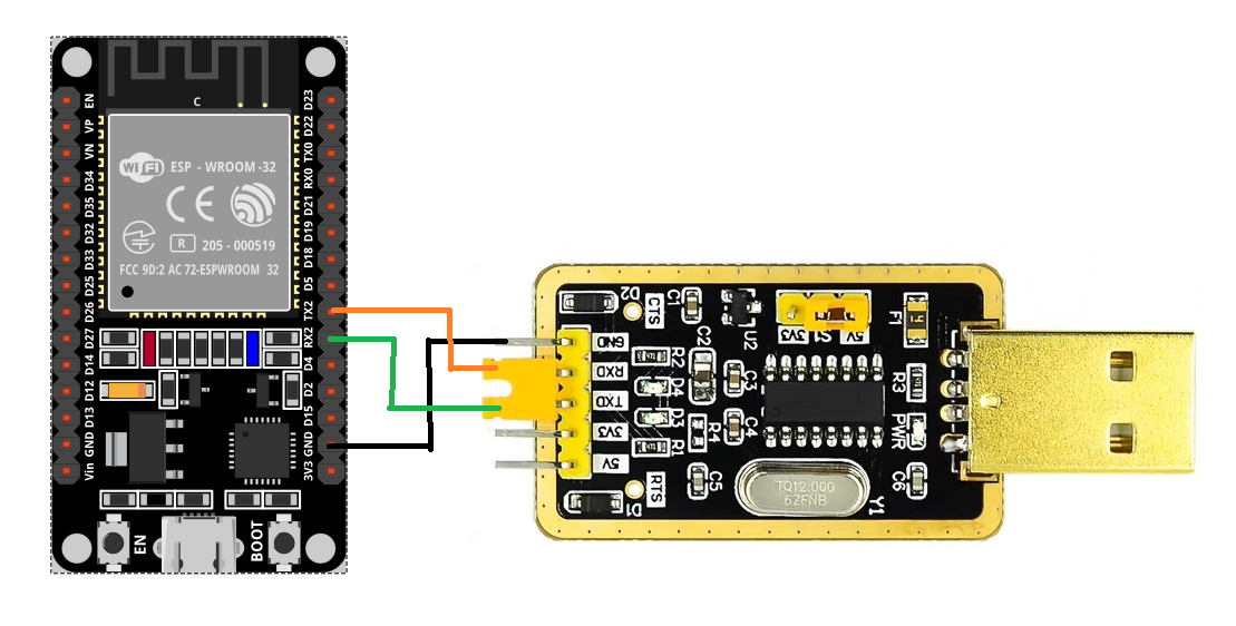 ESP32 的 RX2 引脚连串口模块的 TX,TX2 连 RX,让 ESP32 和 串口模块都连接电脑。
